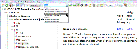 Example: Type "neop" into the Search box on the toolbar (search default is main terms). The pull down will list main terms starting with neop. If searching for "neoplasm", click on that term in the list that's generated to take you to the Neoplasm table in ICD-9-CM. Scroll down to see the Smart Table Headings retained at the top of the screen for easy identification of the table information. More powerful search info in Help/Contents.
